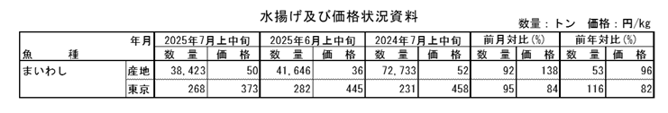 7月上中旬の主要港における水揚量(以下「7月上中旬の水揚量」という。)は38,000トンで、前月から8%減少し、前年同月から47%減少した。価格は50円/kgで、前月の38%高、前年同月の4%安であった。