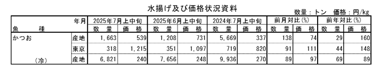 7月上中旬の生鮮かつおの水揚量は1,600トンで前月から38%増加し、前年同月から71%減少した。価格は539円/kgで、前月の26%安、前年同月の60%高であった。