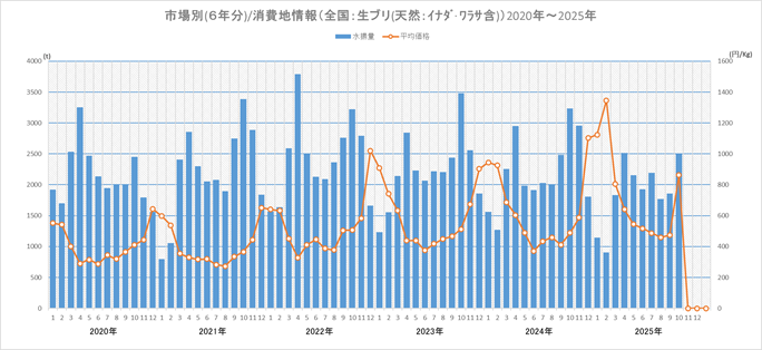 9月における生鮮天然ブリ(イナダ、ワラサを含む)の全国主要港水揚量(速報値)は前年同月比35%減の3086トンと減少した。北海道東部のマイワシ漁に出漁する船が増え、東シナ海に残った巻網船は対馬沖のサバ漁が好調で、アジやサバを狙う船が多かった。
