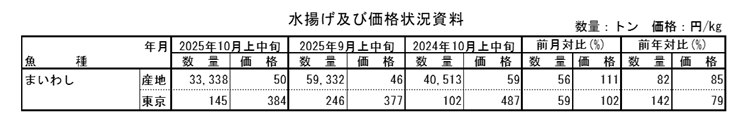 消費地(東京)におけるまいわしの入荷先は、北海道・愛知主体に三重・鹿児島等からであった。10月上中旬の入荷量は前月から41%減少し、前年同月から42%増加した。価格は前月並み、前年同月の21%安であった。