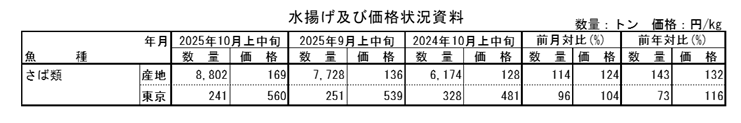 消費地(東京)におけるさば類の入荷先は、まさばは宮城主体に富山・三重・長崎等から、ごまさばは宮城主体に岩手・千葉・静岡・三重等からであった。10月上中旬の入荷量は前月から4%減少し、前年同月から27%減少した。価格は前月の4%高、前年同月の16%高であった。