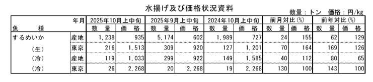 消費地(東京)におけるするめいかの入荷先は、北海道・青森・岩手・宮城等からであった。10月上中旬の生鮮するめいかの入荷量は前月から30%減少し、前年同月から69%増加した。価格は前月の64%高、前年同月の26%高であった。