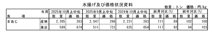 消費地(東京)におけるまあじの入荷先は、中あじは長崎主体に宮城・千葉・石川・三重・鳥取・佐賀等、中小あじは宮城・三重等、小・豆あじは三重主体に高知等からであった。10月上中旬の入荷量は前月から17%増加し、前年同月から6%減少した。価格は前月の8%安、前年同月の3%高であった。