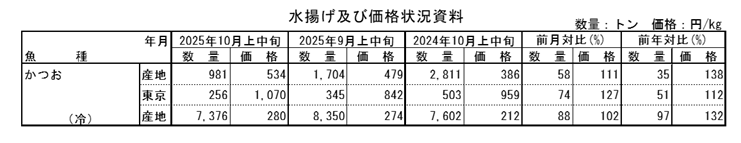 10月上中旬の生鮮かつおの水揚量は980トンで前月から42%減少し、前年同月から65%減少した。価格は534円/kgで、前月の11%高、前年同月の38%高であった。