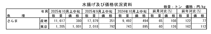 消費地(東京)におけるさんまの入荷は、北海道・岩手・宮城・福島からであった。10月上中旬の入荷量は前月から40%減少し、前年同月から62%増加した。価格は前月の26%高、前年同月の12%高であった。