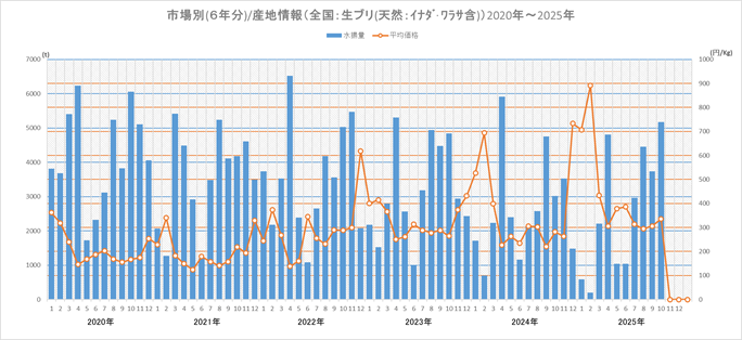 10月における生鮮天然ブリ(イナダ、ワラサを含む)の全国主要港水揚量(速報値)は前年同月比63%増の4936トンと増加した。漁港別で境港(鳥取)が3・9倍の2177トン、銚子(千葉)が15倍の382トンと伸長した。