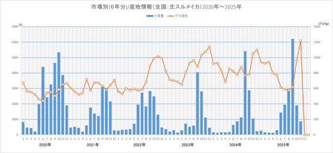 11月の全国主要港の生鮮スルメイカ水揚量は、漁獲枠(TAC)の超過で小型イカ釣の操業が停滞するなど、前年同月比17%減の878トンだった。5~9月に前年よりハイペースで獲り、枠を消化。11月は残枠のある三陸の沖合底引網や沿岸漁業が生産の中心となった。
