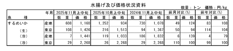 消費地(東京)におけるするめいかの入荷先は、青森主体に北海道・岩手・秋田・宮城等からであった。11月上中旬の生鮮するめいかの入荷量は前月から50%減少し、前年同月から14%増加した。価格は前月の6%安、前年同月の4%高であった。
