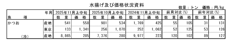 11月上中旬の生鮮かつおの水揚量は540トンで前月から45%減少し、前年同月から69%減少した。価格は558円/kgで、前月の5%高、前年同月の31%高であった。