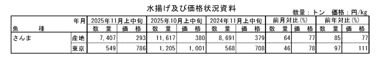 消費地(東京)におけるさんまの入荷は、北海道・宮城・福島・千葉からであった。11月上中旬の入荷量は前月から54%減少し、前年同月から3%減少した。価格は前月の22%安、前年同月の11%高であった。