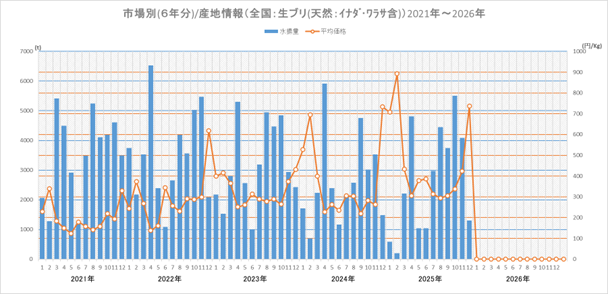 12月1~20日における生鮮天然ブリ(イナダ、ワラサを含む)の全国主要港水揚量(速報値)は、前年同月比58%増の1051トンと増加した。2歳魚以上が少なく、小型魚(0~1歳)が多い。