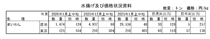 消費地(東京)におけるまいわしの入荷先は、千葉主体に北海道・岩手・愛知・鳥取・鹿児島等からであった。1月上中旬の入荷量は前月から40%減少し、前年同月から43%減少した。価格は前月の10%高、前年同月の38%高であった。
