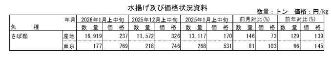 消費地(東京)におけるさば類の入荷先は、まさばは長崎主体に宮城・千葉等から、ごまさばは千葉・静岡・三重等からであった。1月上中旬の入荷量は前月から19%減少し、前年同月から34%減少した。価格は前月の3%高、前年同月の45%高であった。