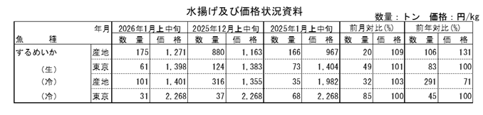 消費地(東京)におけるするめいかの入荷先は、富山主体に岩手・新潟等、活物は千葉・静岡・和歌山等であった。1月上中旬の生鮮するめいかの入荷量は前月から51%減少し、前年同月から17%減少した。価格は前月、前年同月並みであった。