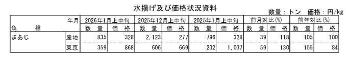 消費地(東京)におけるまあじの入荷先は、中あじは三重・鳥取・高知・佐賀・長崎等、中小あじは 千葉・長崎等、小・豆あじは三重・徳島等からであった。1月上中旬の入荷量は前月から41%減少し、前年同月から55%増加した。価格は前月の30%高、前年同月の16%安であった。