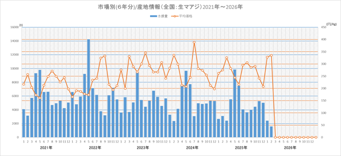 2月1~26日の生鮮マアジ水揚量(速報値)は、前年同月比47%減の1251トンだった。主な漁場は対馬―九州の東シナ海側。西日本大中型巻網船団によるサバ漁が好漁のため、マアジを狙った操業が少ないとみられる。マアジはサバ類に混獲される様相。