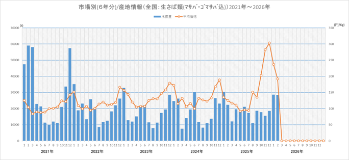 全国主要港における生鮮サバ類(マサバ、ゴマサバ含む)の2月水揚量(速報値)は前年同月比15%増の2万5845トンだった。平均キロ単価は60%高の200円で、ノルウェー産サバの高騰を背景に相場は大幅に上昇した。2月は西日本大中型巻網船団によるサバ漁が盛漁期終盤に当たるが、境港(鳥取県)や松浦(長崎県)を中心に好調な水揚げとなった。