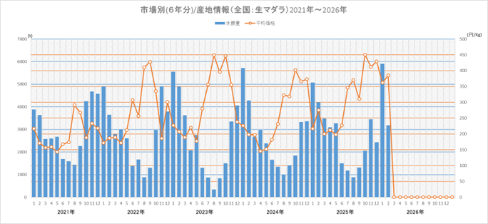 2月における生鮮天然マダラの北海道の主要港水揚量(速報値)は小樽が前年同月比34%増の988トン、歯舞が2・1倍の218トン、花咲が3・9倍の93トンと伸長した。黒潮大蛇行の解消に伴い、道東-三陸沖の親潮系冷水の勢力が強まったことで、(冷水域を好む)マダラ漁は比較的好調だった。